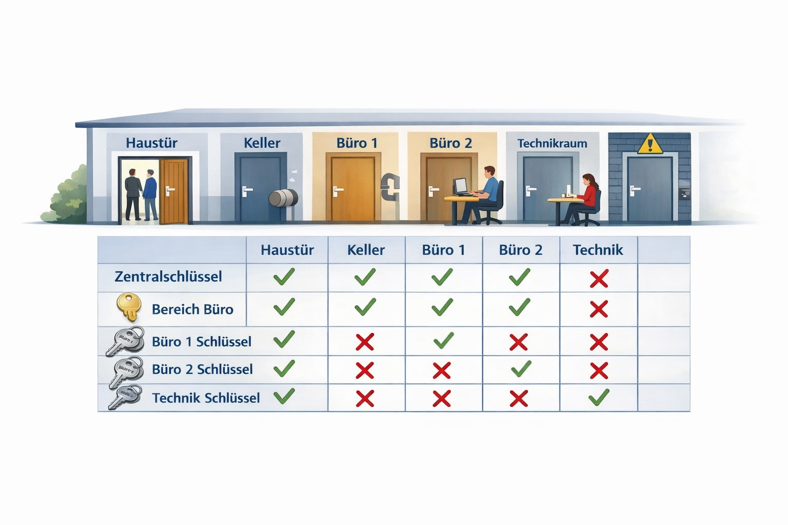Jede Schließanlage beginnt mit einer genauen Analyse. Im Rahmen der Schließanlagen erfasse ich alle Türen, Zugangsbereiche und Nutzergruppen. Auf dieser Basis entsteht ein übersichtlicher Schließplan. Dieser legt fest, welcher Schlüssel welche Türen öffnet. So bleibt die Kontrolle jederzeit erhalten.